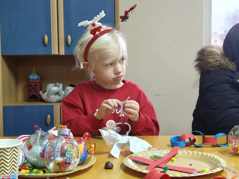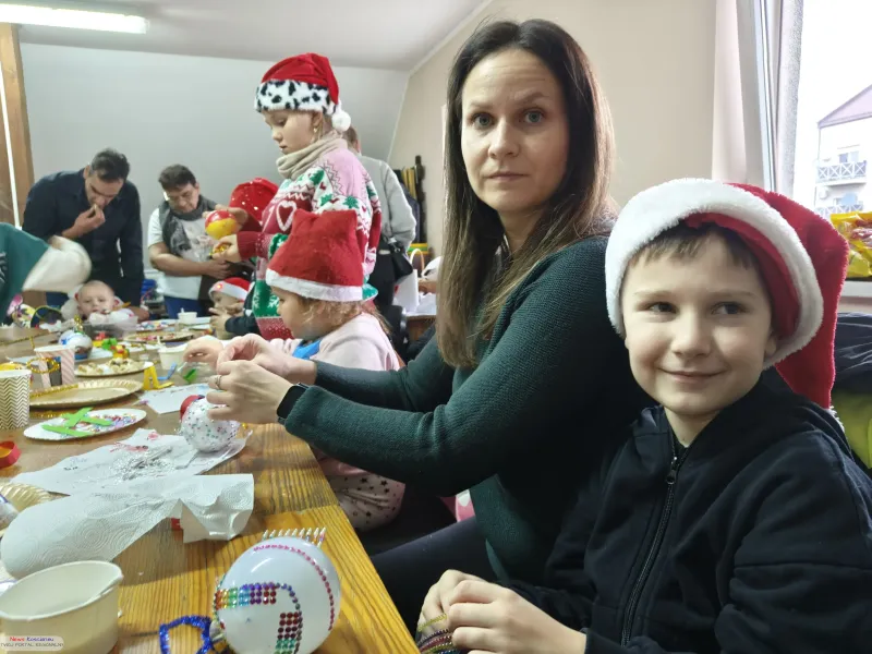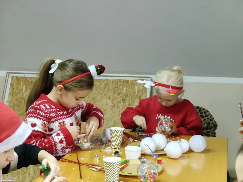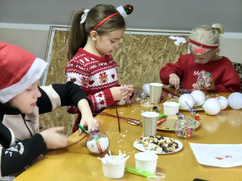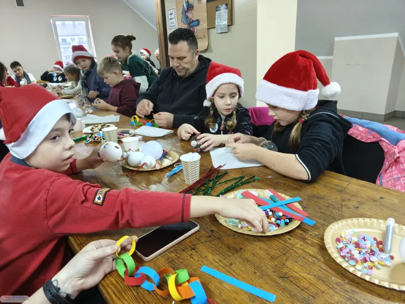 Impreza rozpoczęła się w salce przy Orliku, która na kilka godzin stała się pracownią artystyczną. Dzieci wraz z rodzicami z zapałem oddały się ręcznemu zdobieniu bombek oraz wspólnemu tworzeniu długiego, kolorowego łańcucha na choinkę.